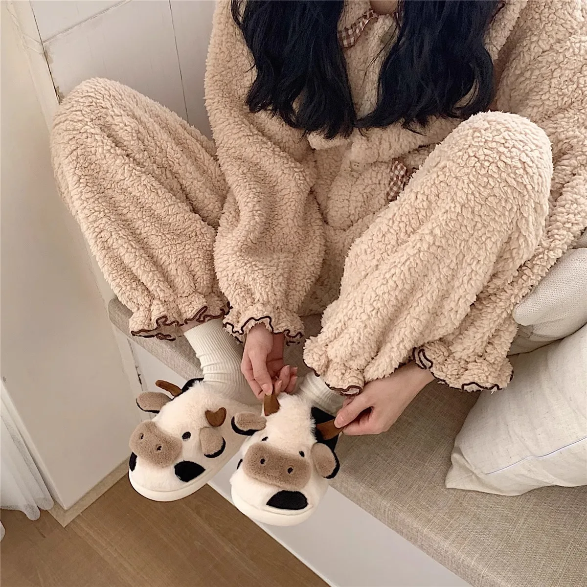 Ladies' Winter Slippers Cute Cartoon Heart Animal Cow Fur Warm Cotton Anti-Slip Home Comfortable Girls' Footwear